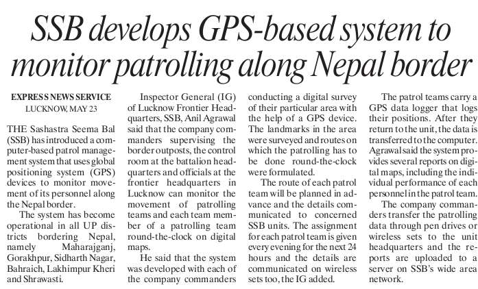 The Patrol Management System was implemented in the Sashastra Seema Bal ( SSB ) , a Central Armed Police Force under the Ministry of Home Affairs along the Indo-Nepal Border in 2010 .