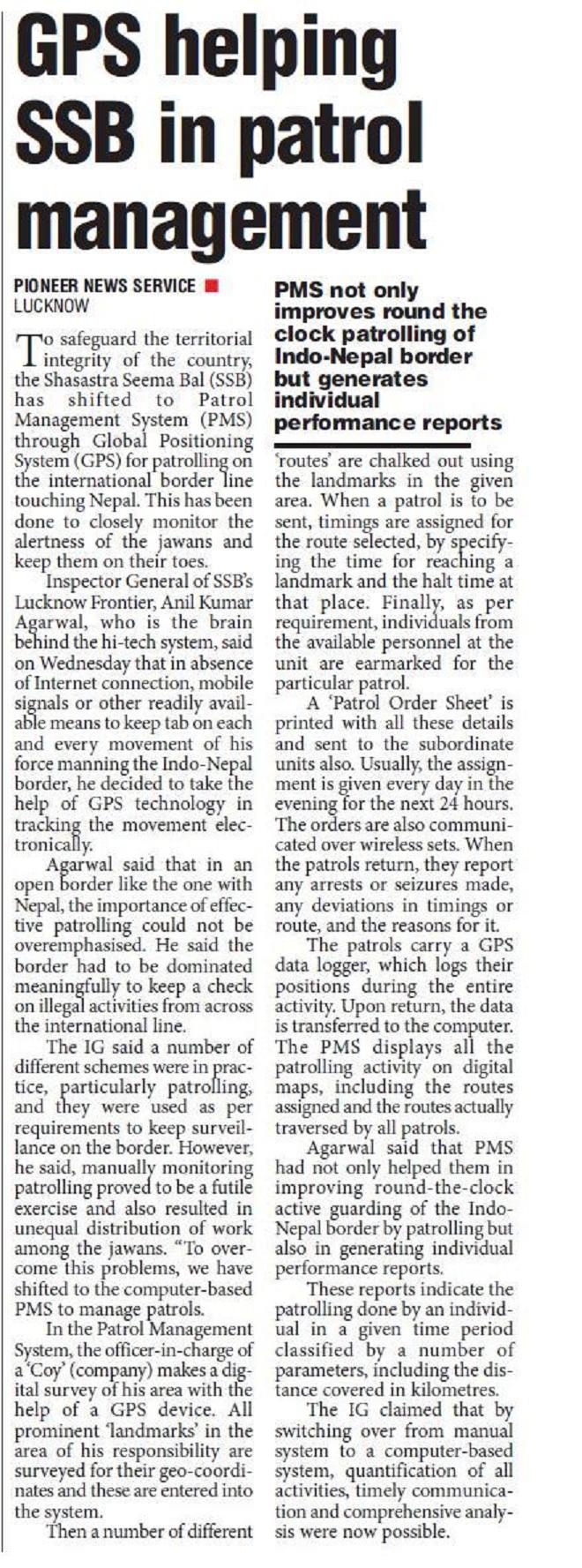 The Patrol Management System was implemented in the Sashastra Seema Bal ( SSB ) , a Central Armed Police Force under the Ministry of Home Affairs along the Indo-Nepal Border in 2010 .